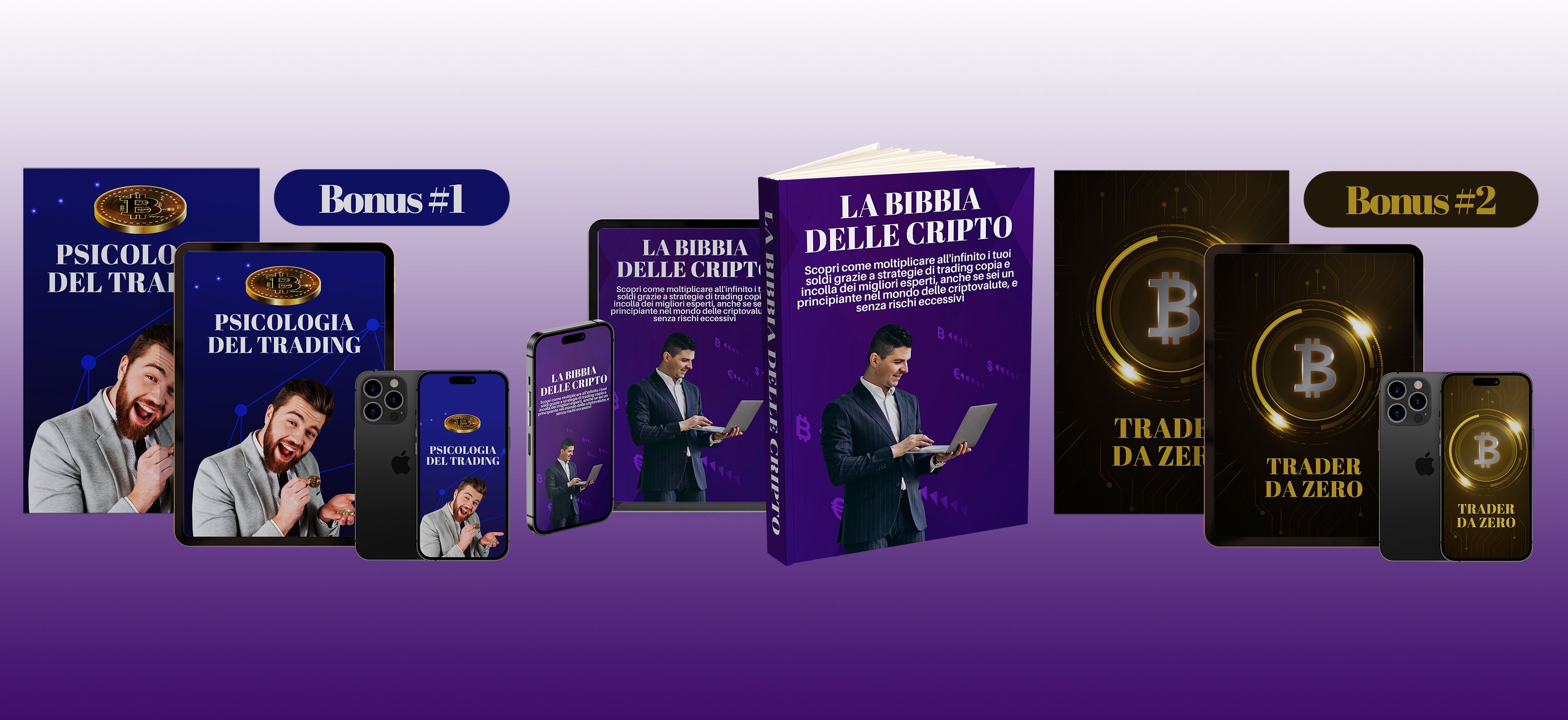 L'offerta esclusiva che ti proponiamo oggi include non solo l’ebook principale La Bibbia delle Cripto, ma anche due bonus esclusivi che ti aiuteranno a massimizzare i tuoi risultati, il tutto per soli 39€.